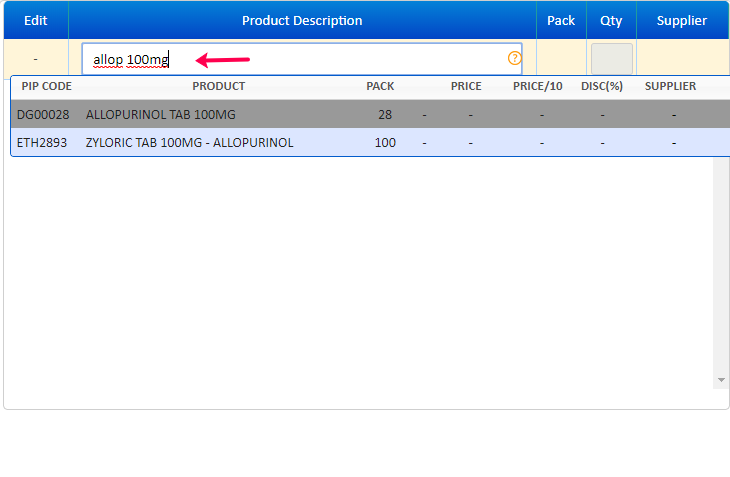 Search Allopurinol 100mg in the search box, select the cheapest product and enter the quantity you would like to order.
